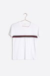Perfect plain white tee with the added blue and red stripe band in the middle. Great for wearing alone or pairing with a jacket. Model is 5'7" wearing a size Small.
